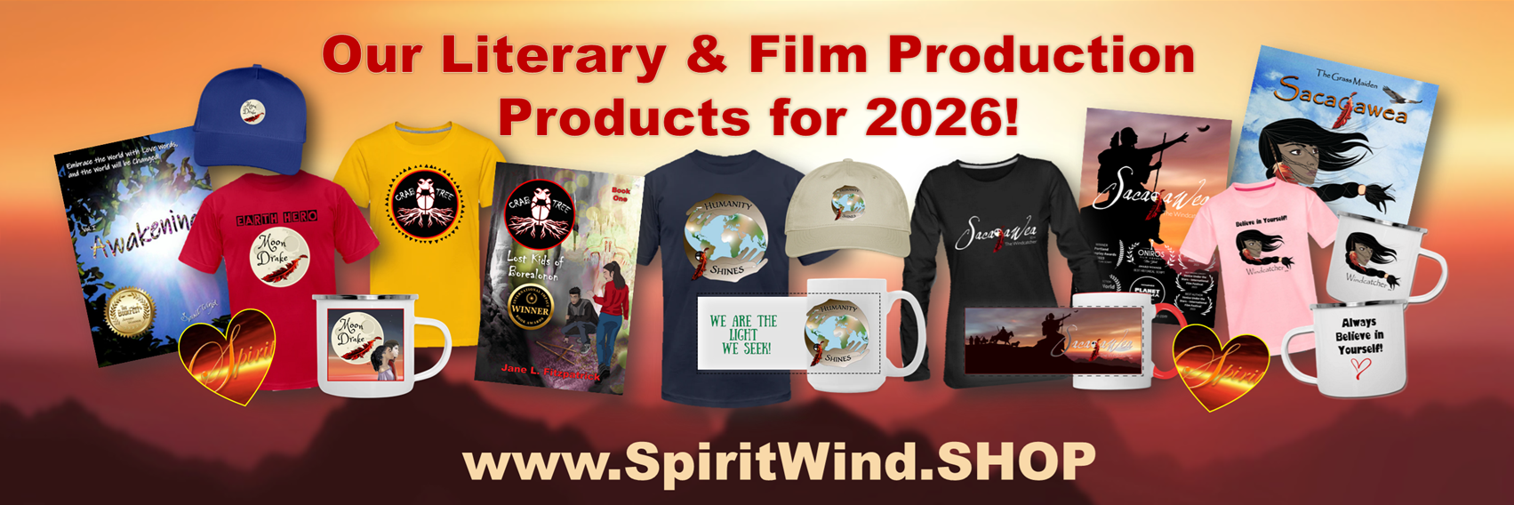 Spirit Wind Collection, the Official Online Store for all film, television and media projects, offers T-shirts & sweatshirts, beanies, baby clothes, tote bags, mugs, water bottles, books, dolls including all the items associated with the feature film, Sacajawea, The Windcatcher, the Moon Drake Series for children, causes and non-profit organizations include Humanity Shines Organization and its programs, PAZA Tree of Life, Growing Seeds Worldwide Foundation, and the Warrior Woman Spirit campaign.